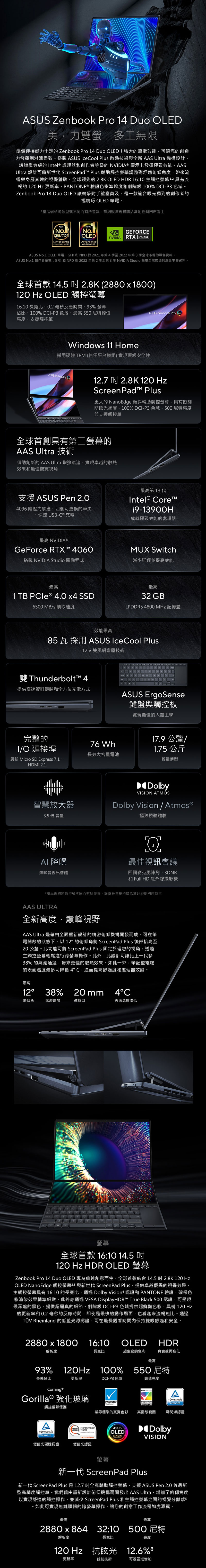 LCD尺寸:14.5" 2.8K (2880 x 1800) OLED 16:10 aspect ratio 12.7 吋 2.8K 120 Hz ScreenPad™ Plus