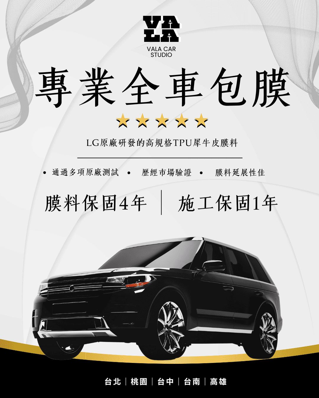 在保固期限內,本公司僅對車衣膜本身缺陷造成的大面積裂開、大面積起泡提供保固服務。